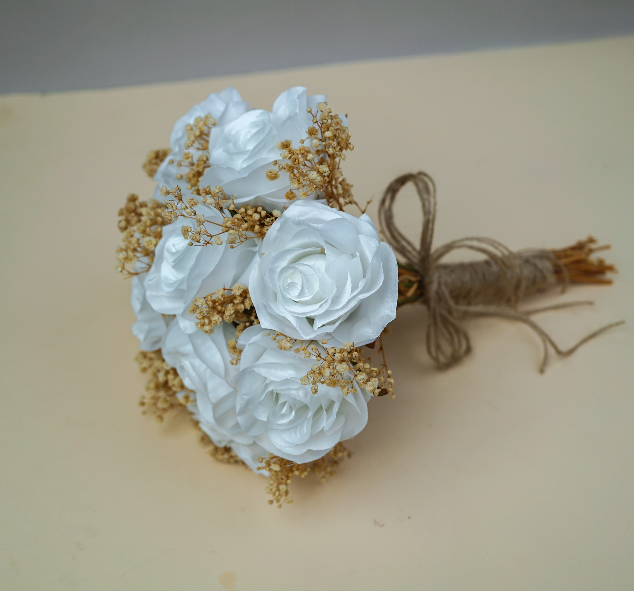 باقة عروس مكوّنة من الورود البيضاء مع زهور البيبي المجففة.