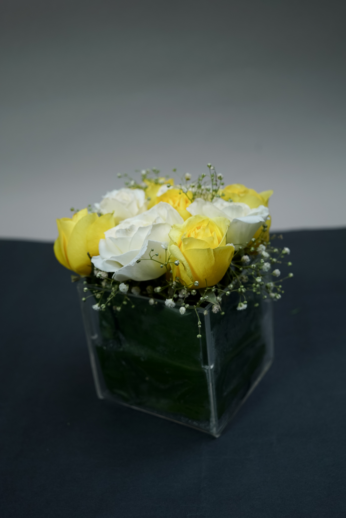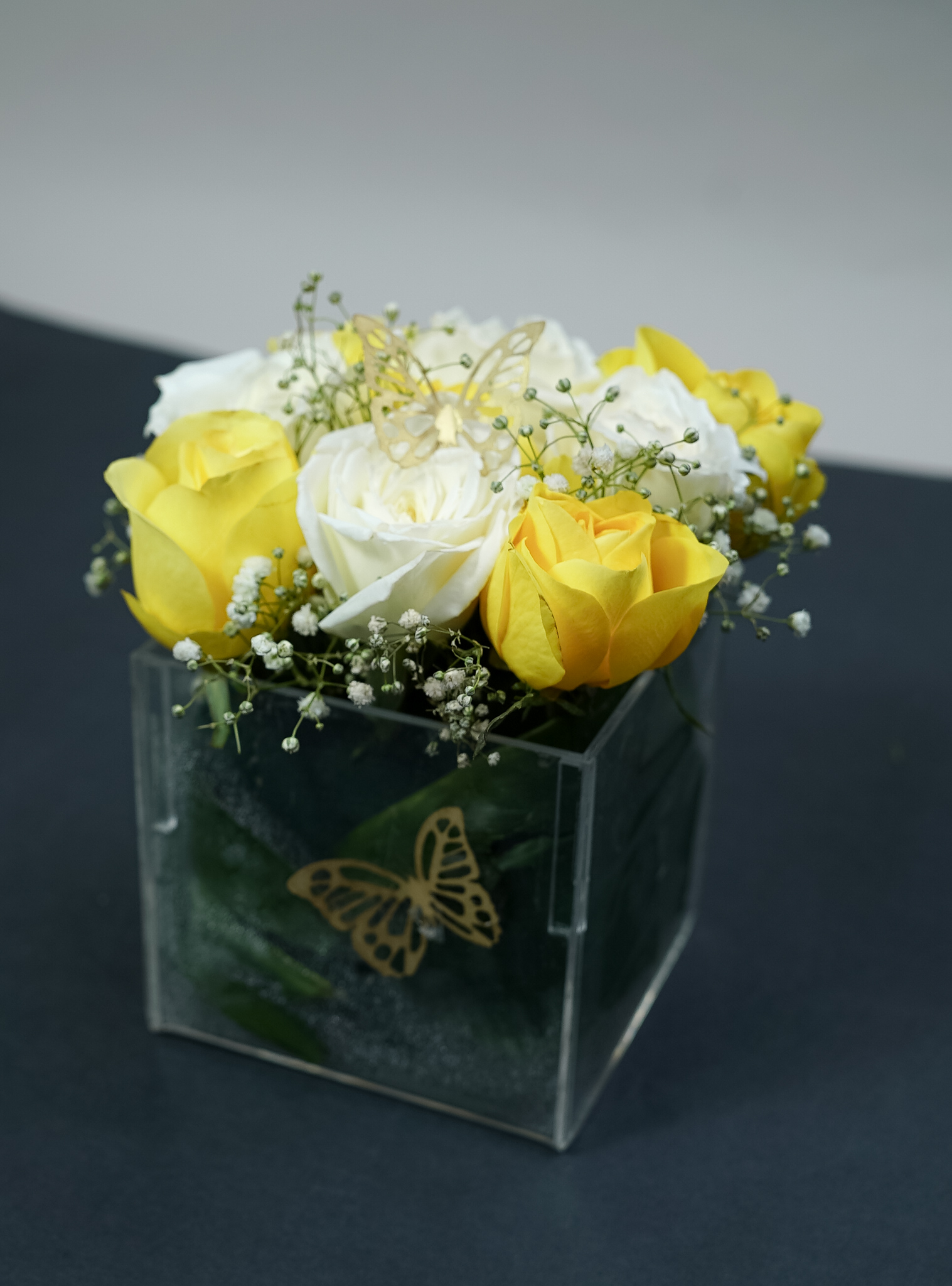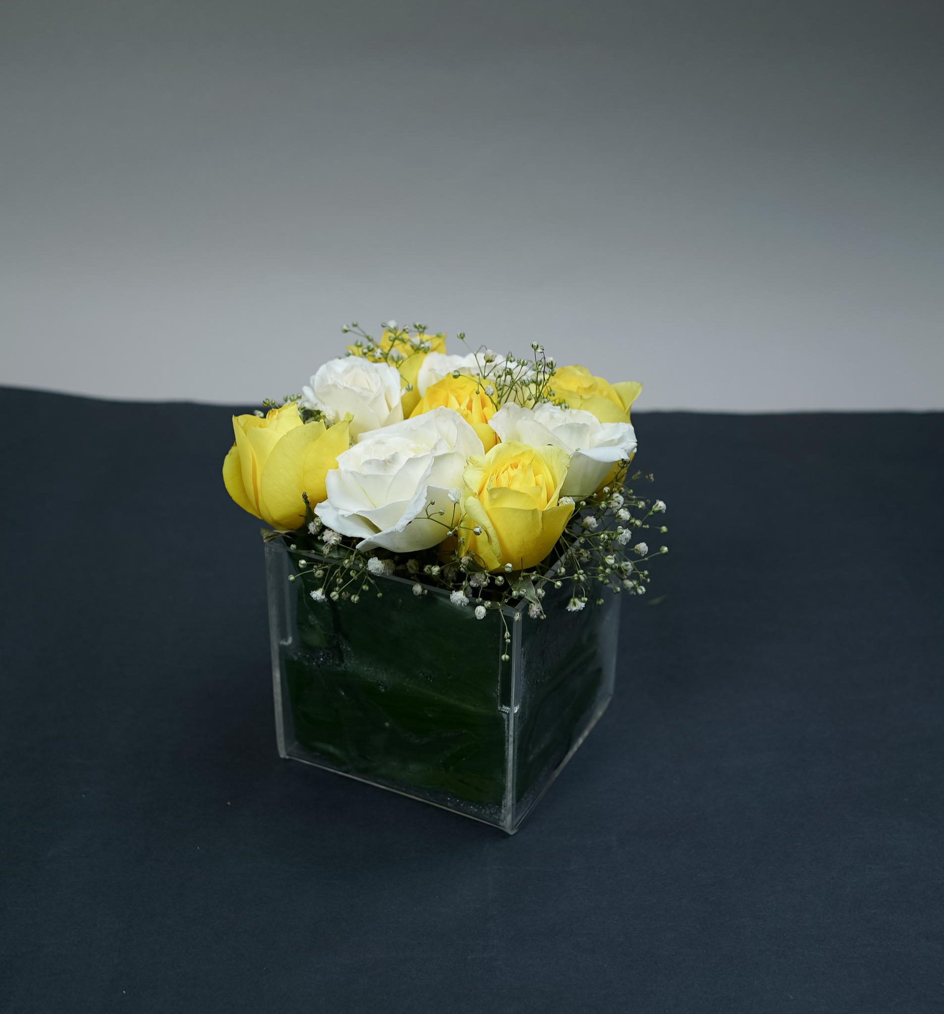 صندوق أكريليك شفاف (10×10 سم) مع 9 وردات (أبيض وأصفر) وورد البيبي فلور