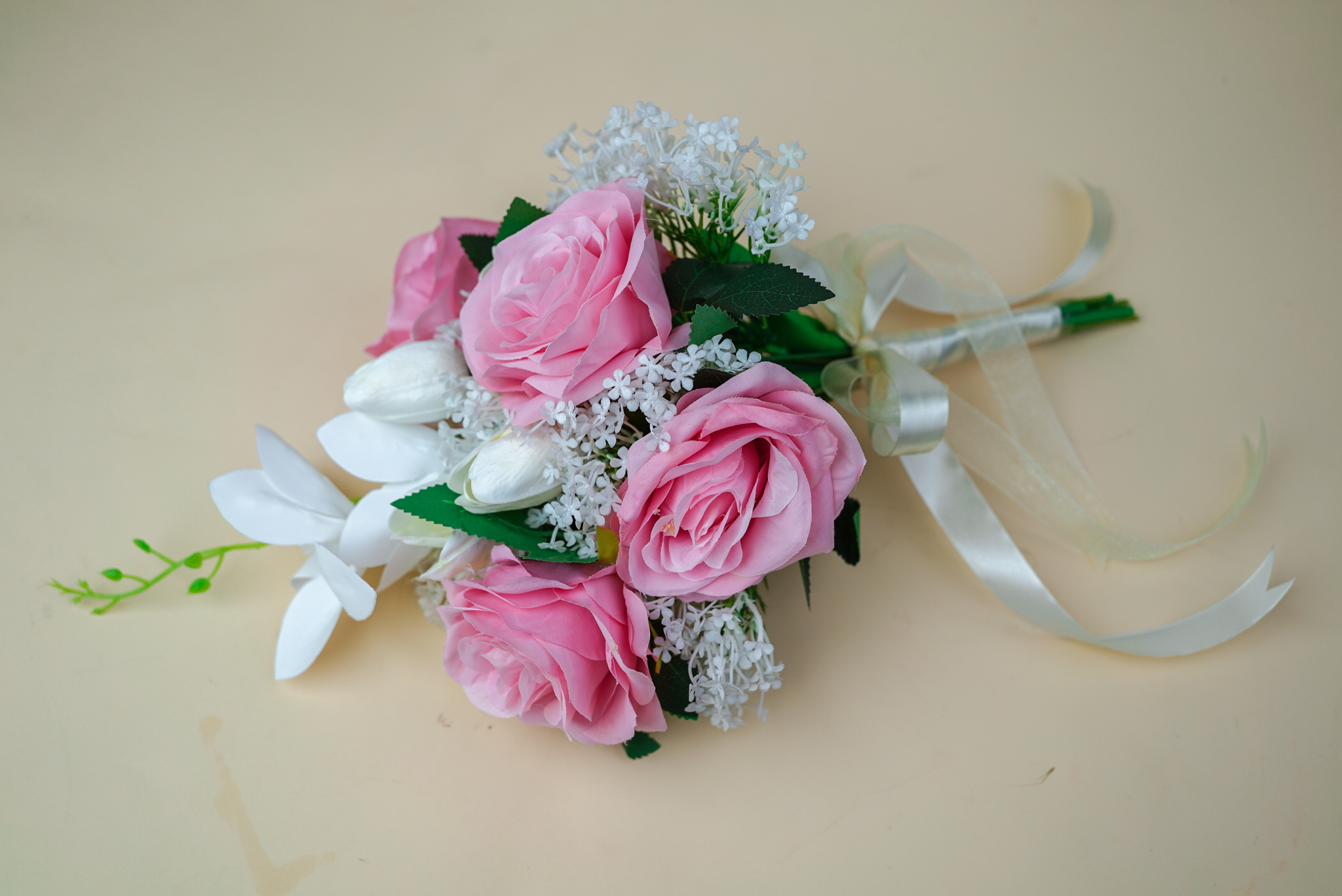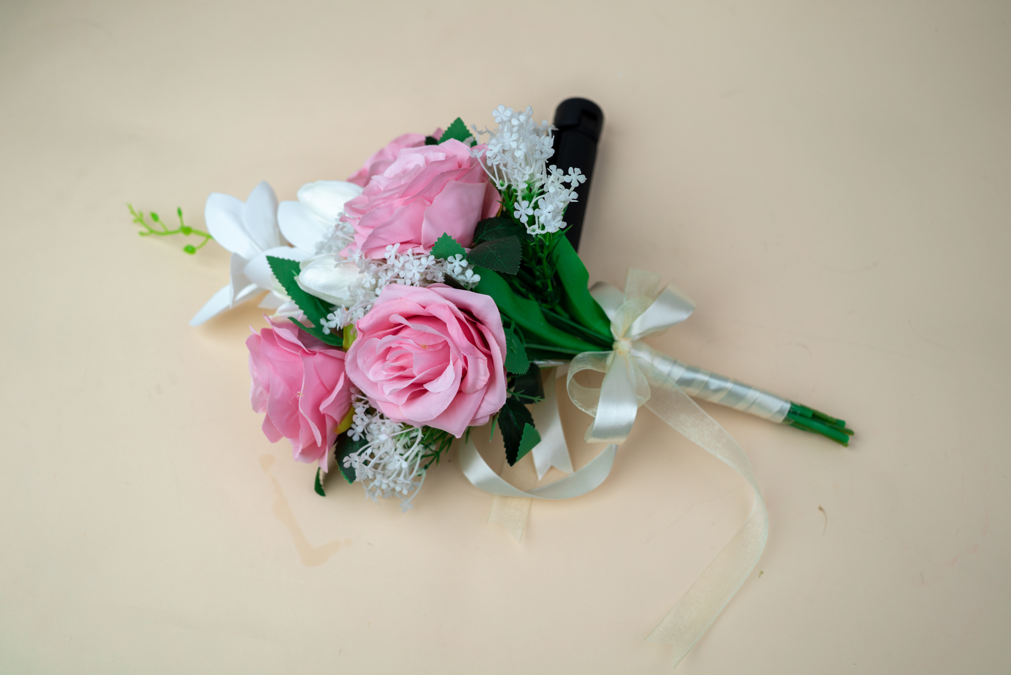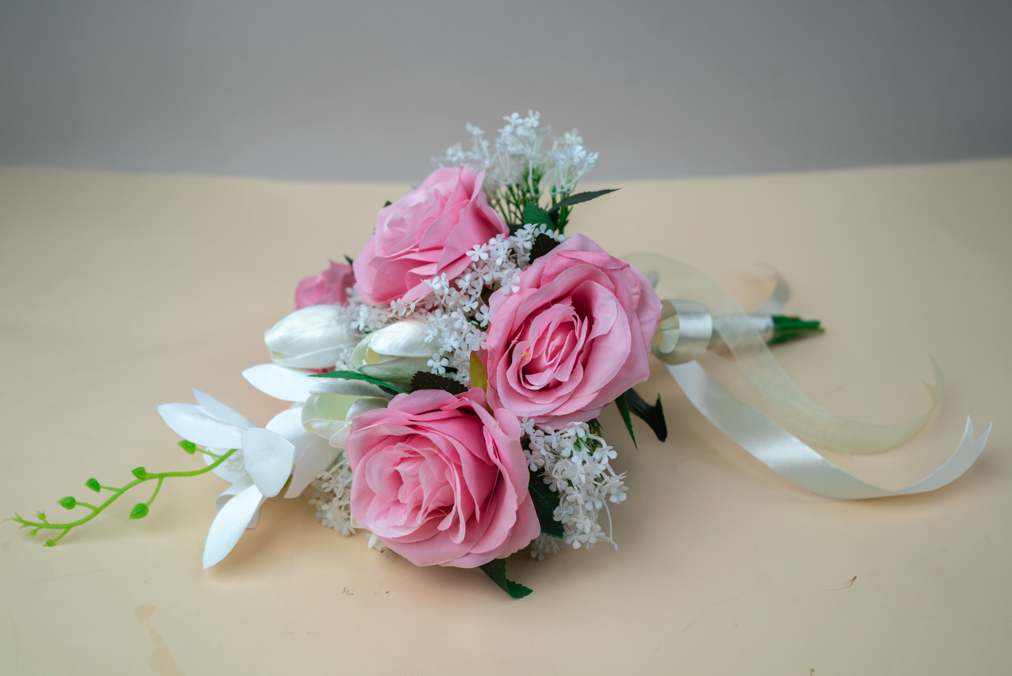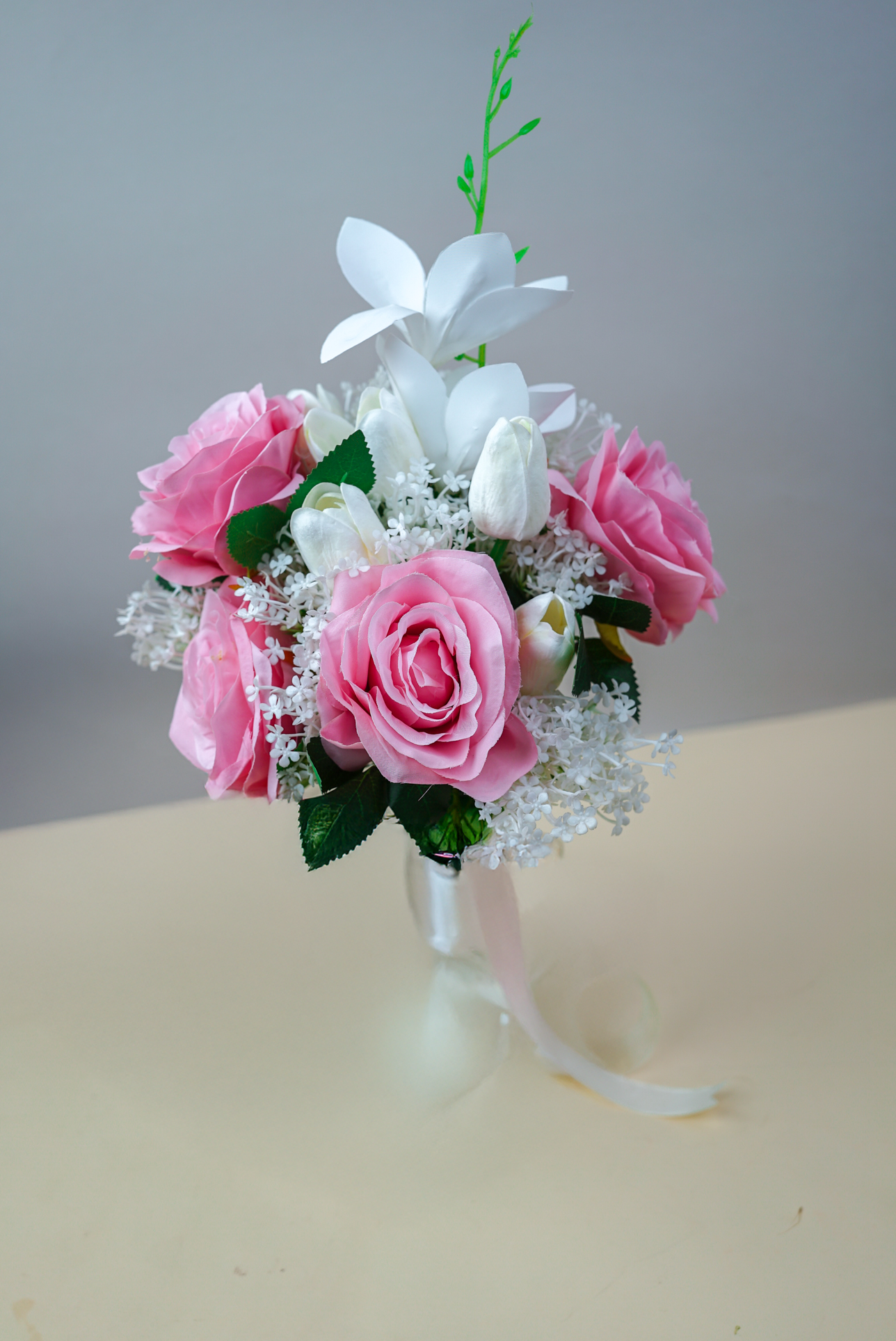باقة العروس المنسقة بعناية: سيمفونية من 5 زهرات توليب بيضاء نقية، و4 وردات جورية وردية رقيقة، مع لمسة فخامة استثنائية من زهرة الأوركيد البيضاء النادرة، وزينة أنيقة من البيبي فلور. صُممت هذه الباقة لتكون الرفيق الأجمل في يومك الكبير.