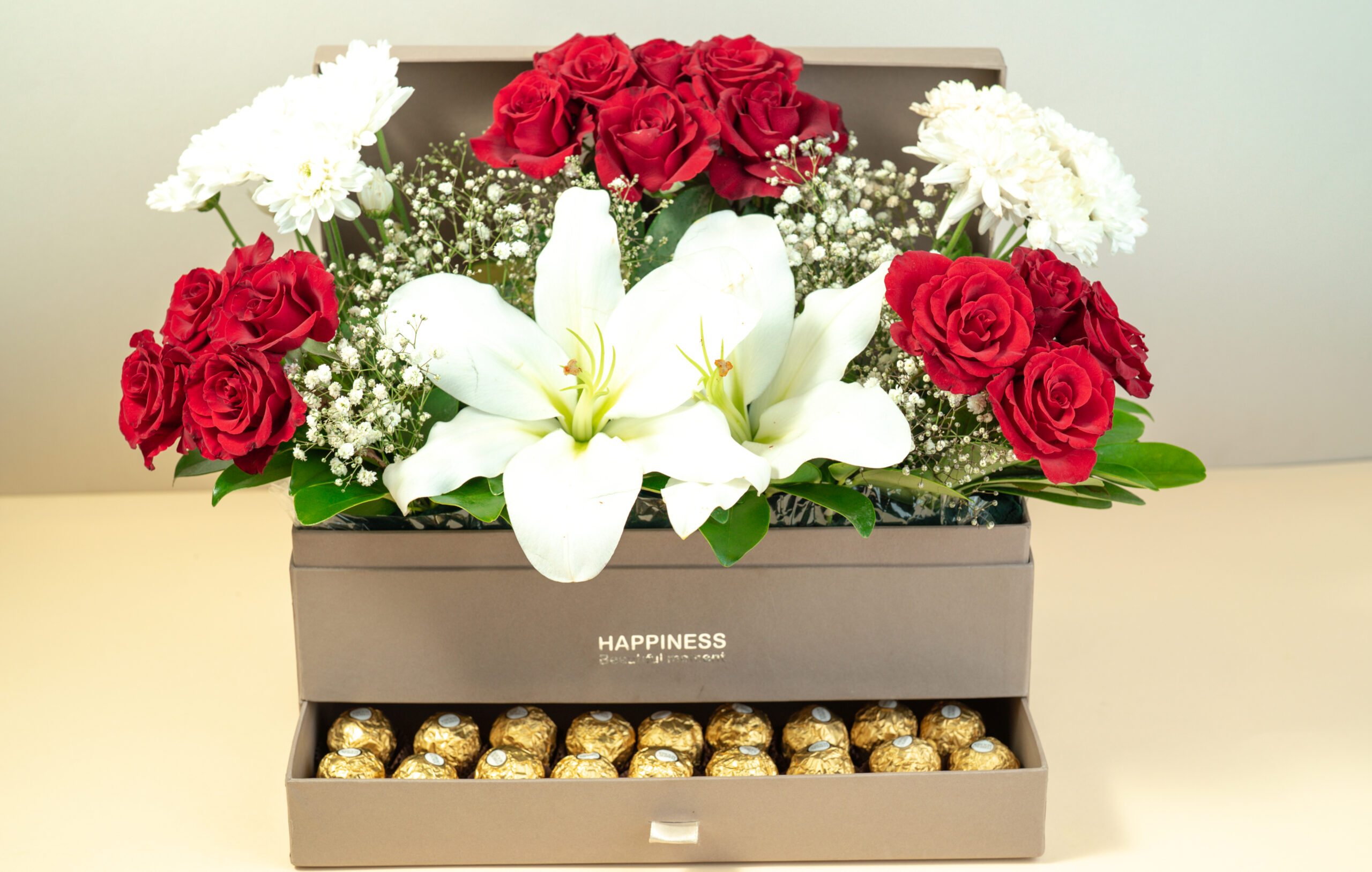 صندوق يجمع بين 14 وردة حمراء، زهور الليلي الأبيض، البيبي فلور، و15 قطعة شوكولاتة فيريرو