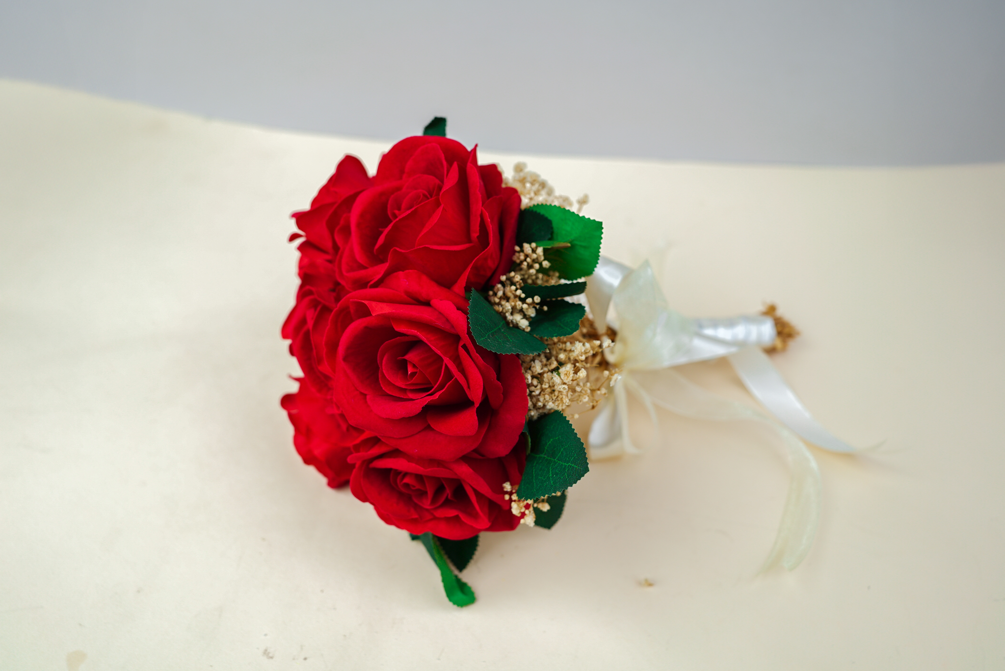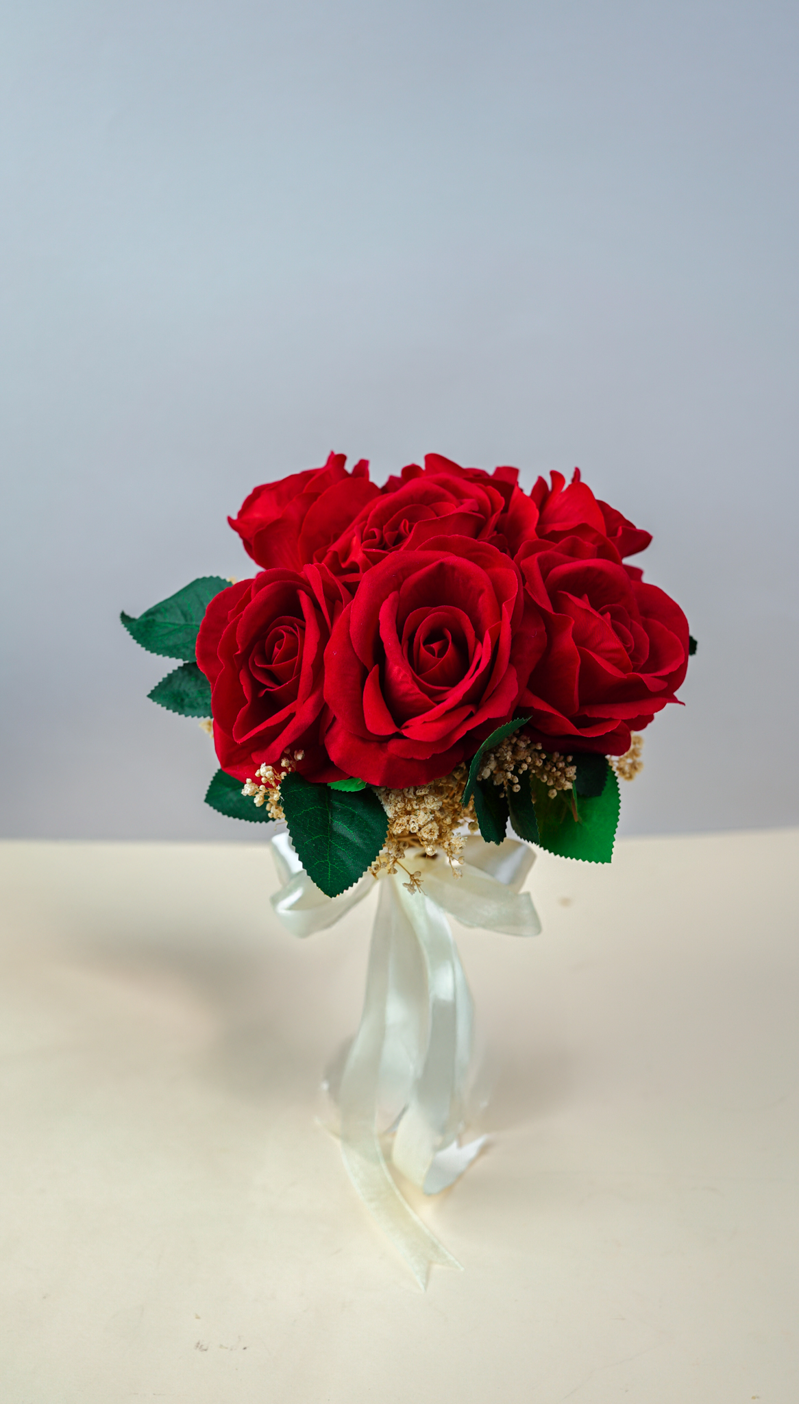 إطلالة بوهيمية فاخرة: باقة عروس صناعية تتميز بـ 7 وردات حمراء زاهية تتداخل مع سحر البيبي فلور المجفف. اختيار مثالي للعروس التي تبحث عن الجمال الذي لا يذبل والتصميم الذي يخطف الأنظار.