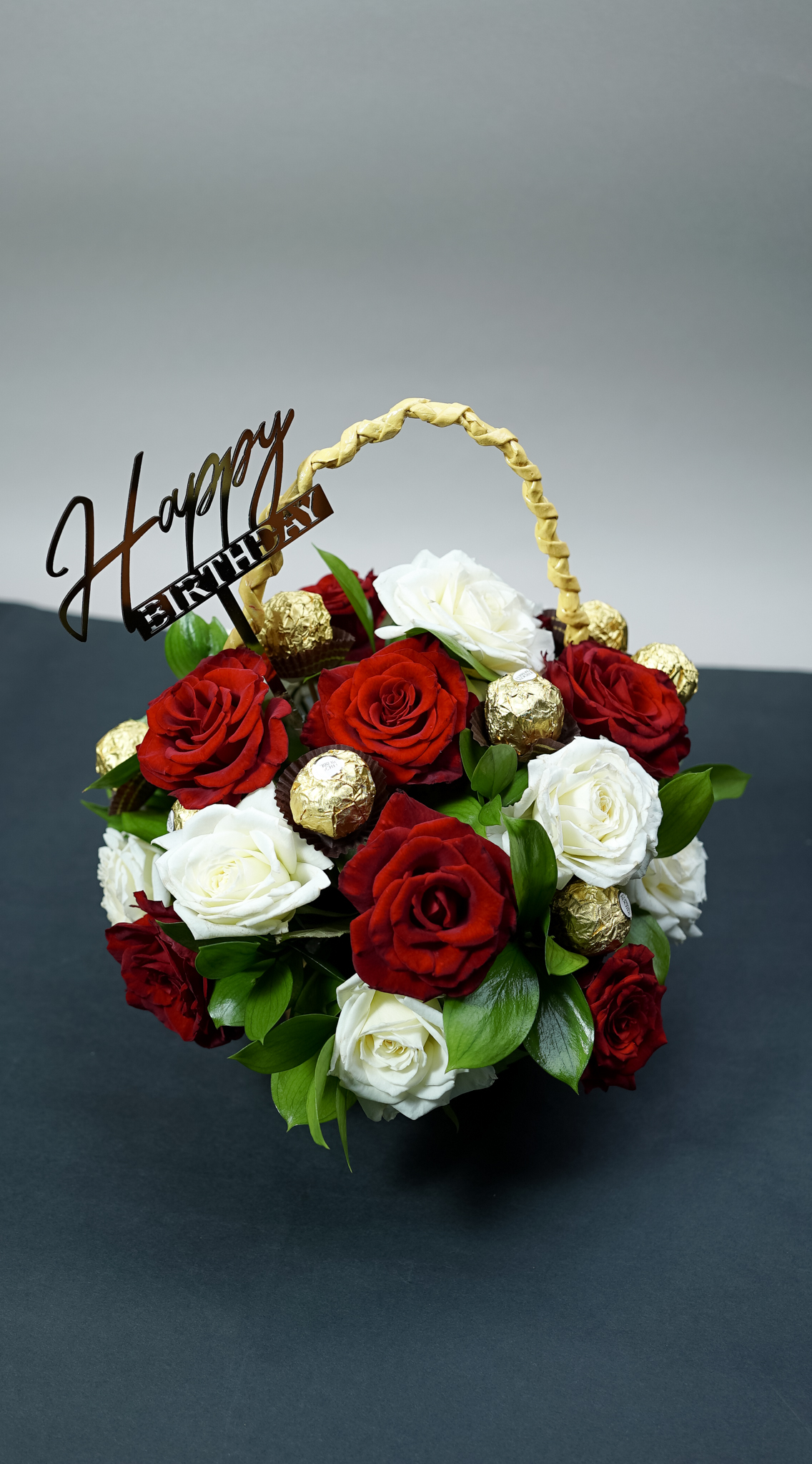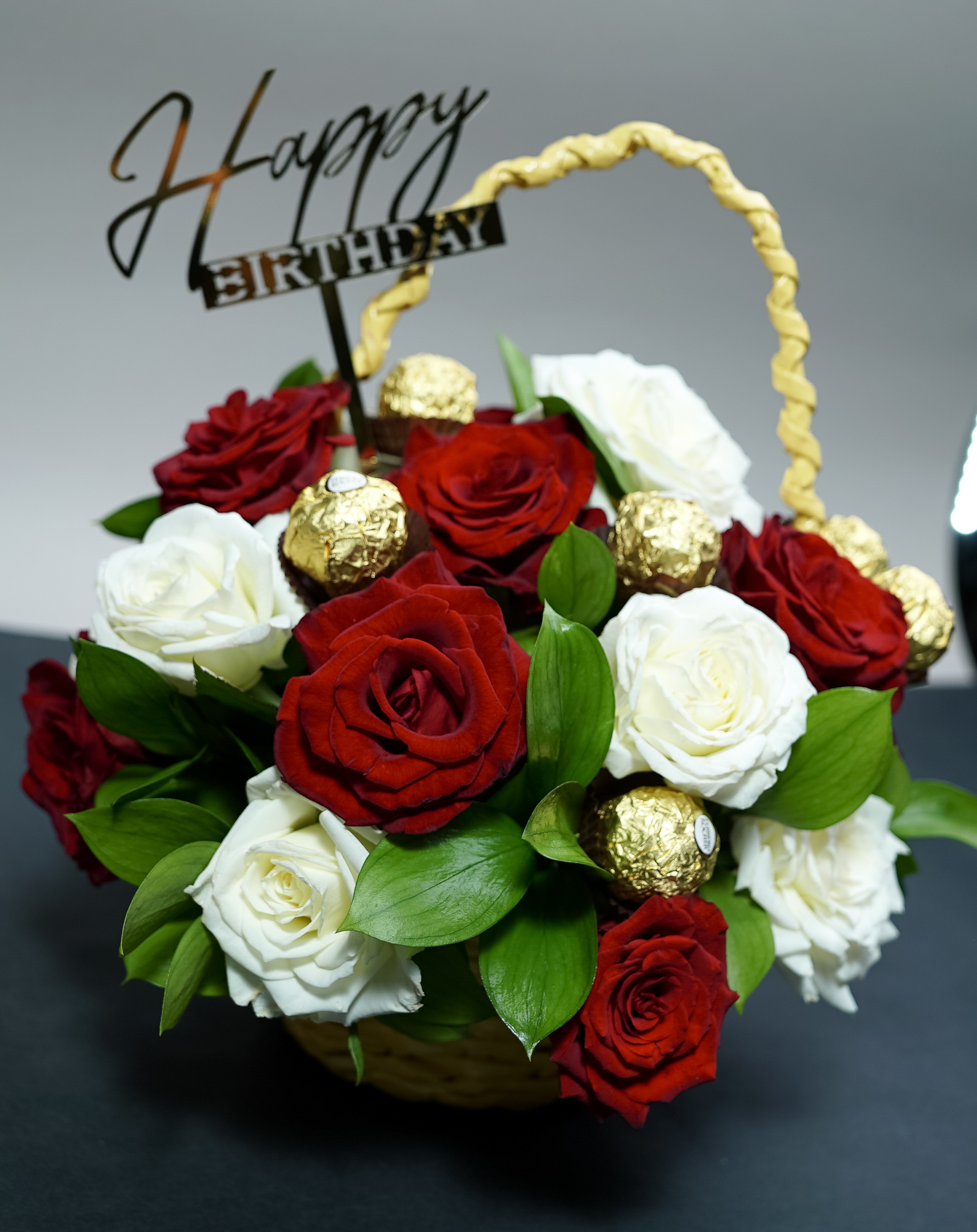 باقة التميز: مزيج من 10 وردات جوري أبيض و10 أحمر في سلة خوص فريدة مع 10 قطع فيريرو