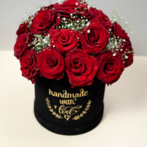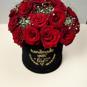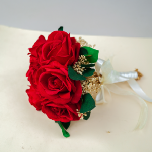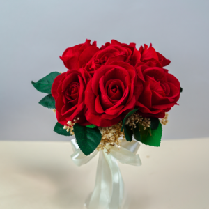 باقة “جوهر الحب”: (10 وردات حمراء مع أوراق خضراء).