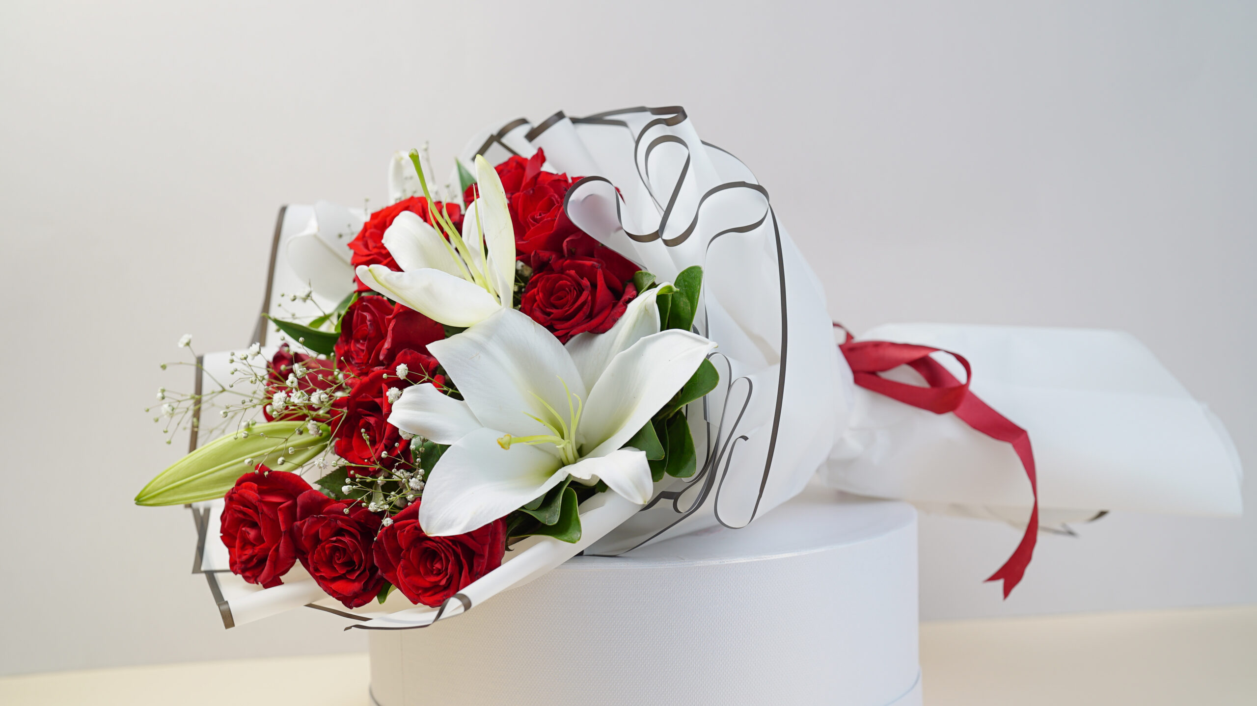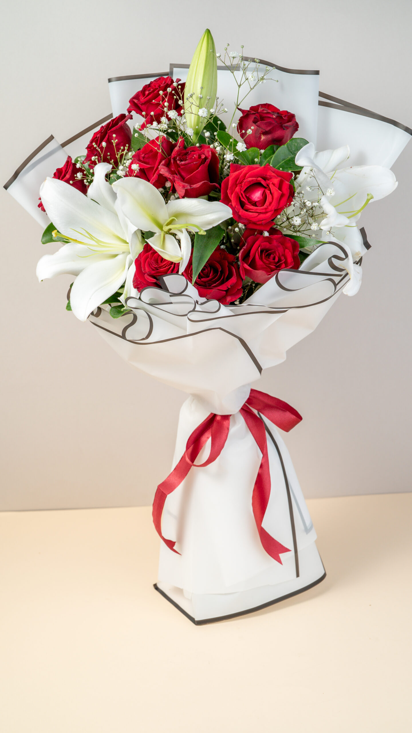 باقة فريدة من زهور الليلي الأبيض، 10 وردات جورية حمراء، وورد صغير (بيبي فلور) أبيض