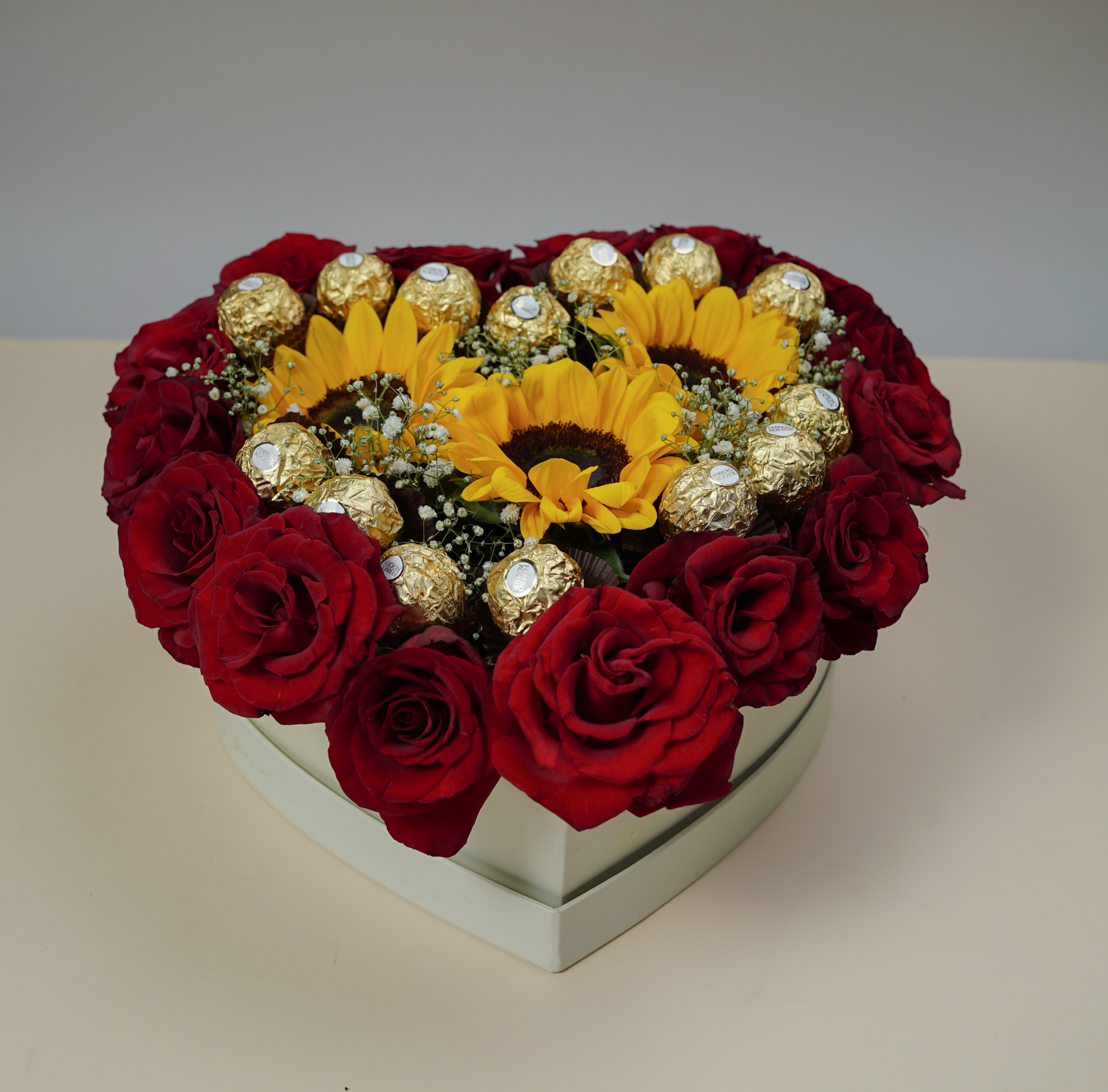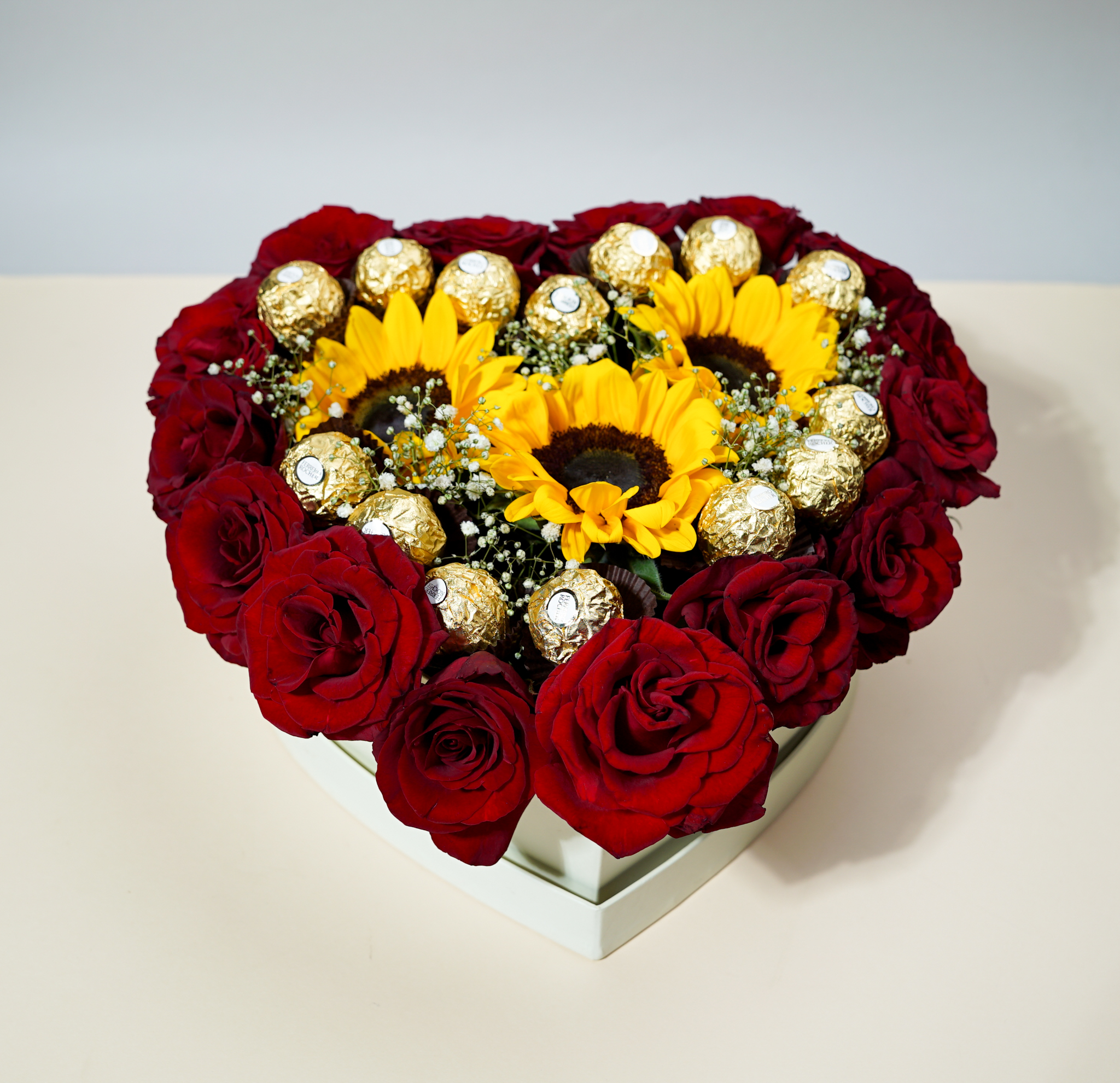 صندوق “شمس وود”: (15 وردة حمراء، عباد شمس، و15 قطعة فيريرو روشيه).