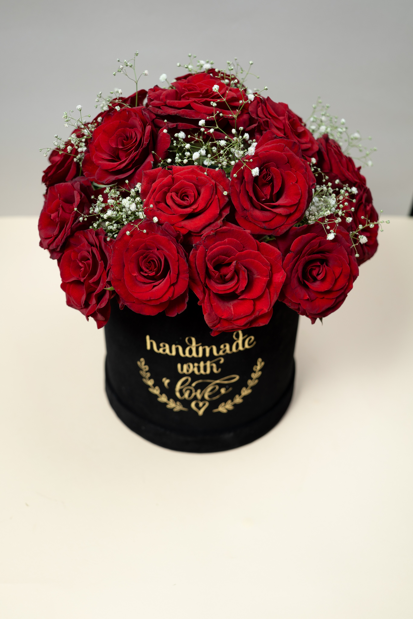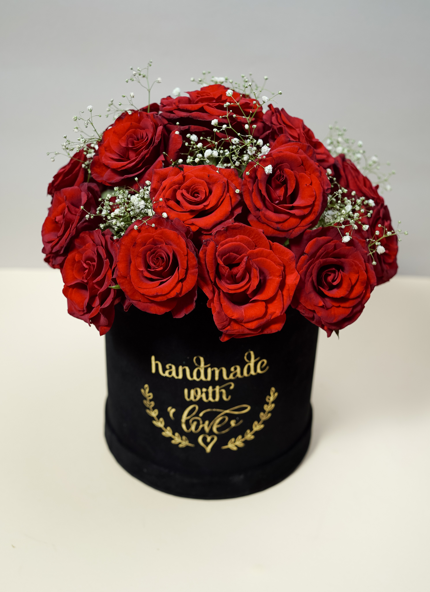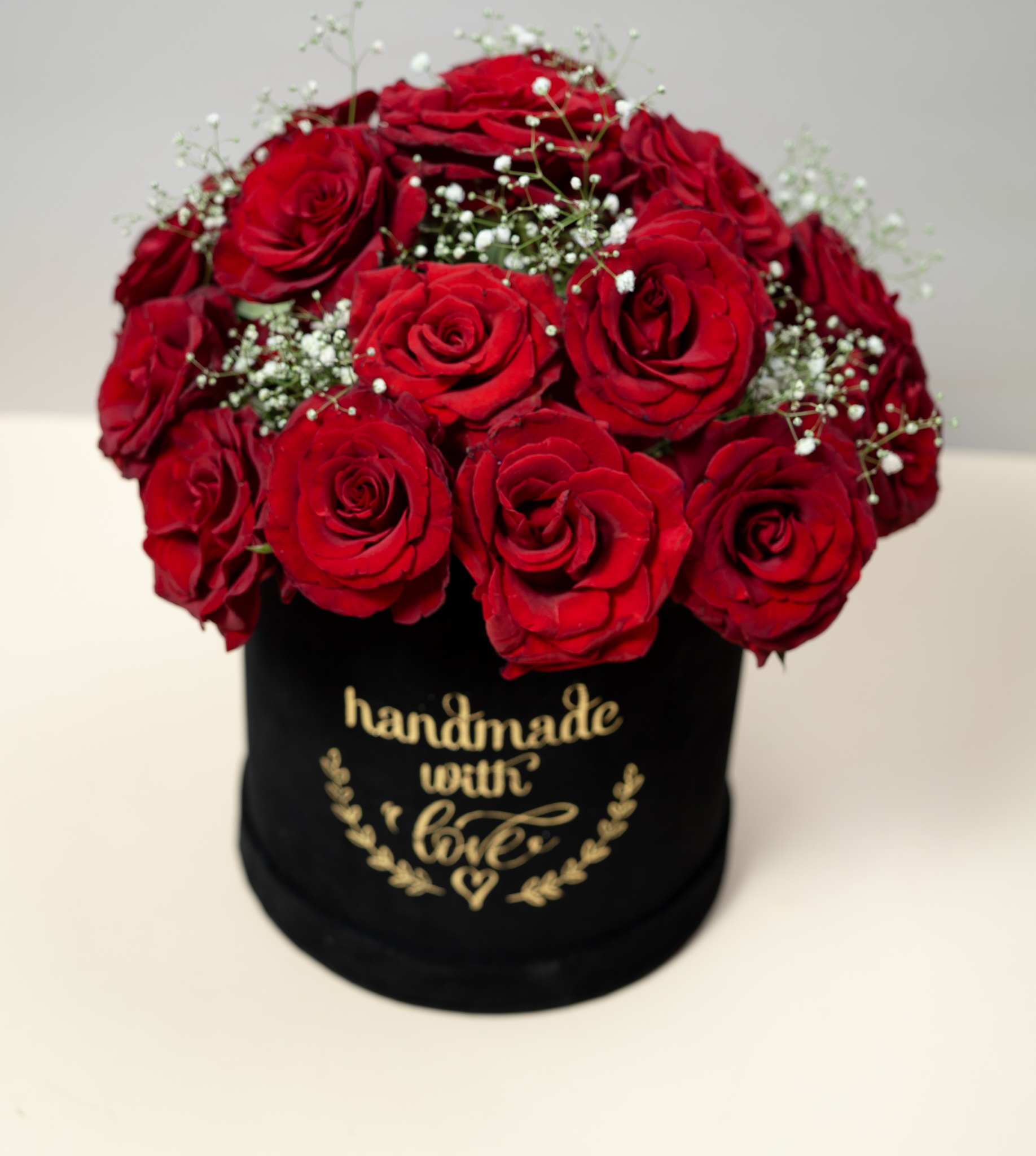 “فخامة البوكس الدائري” (20 وردة جورية حمراء مع بيبي فلور).