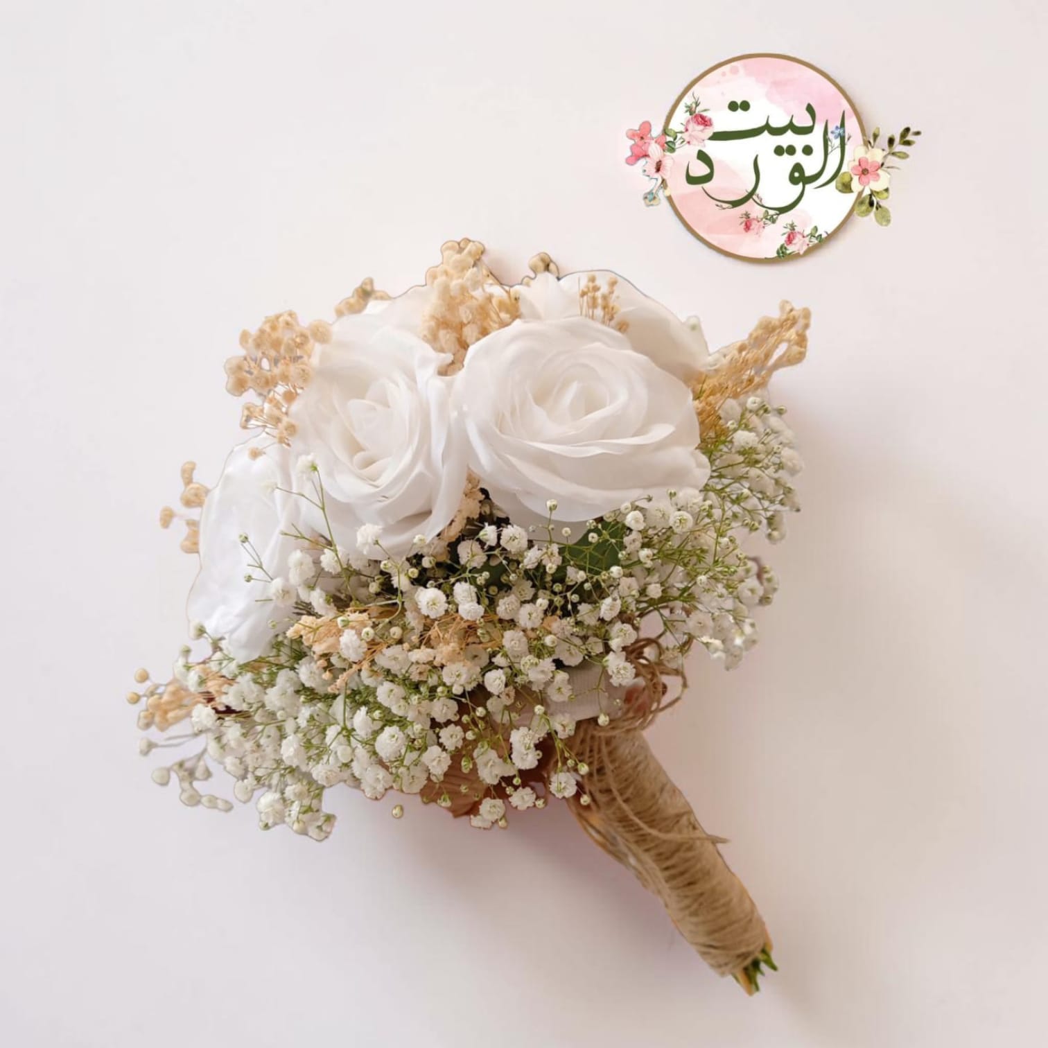 Artificial 8 white roses, dried baij baby flower and white natural baby flower bridal bouquet.