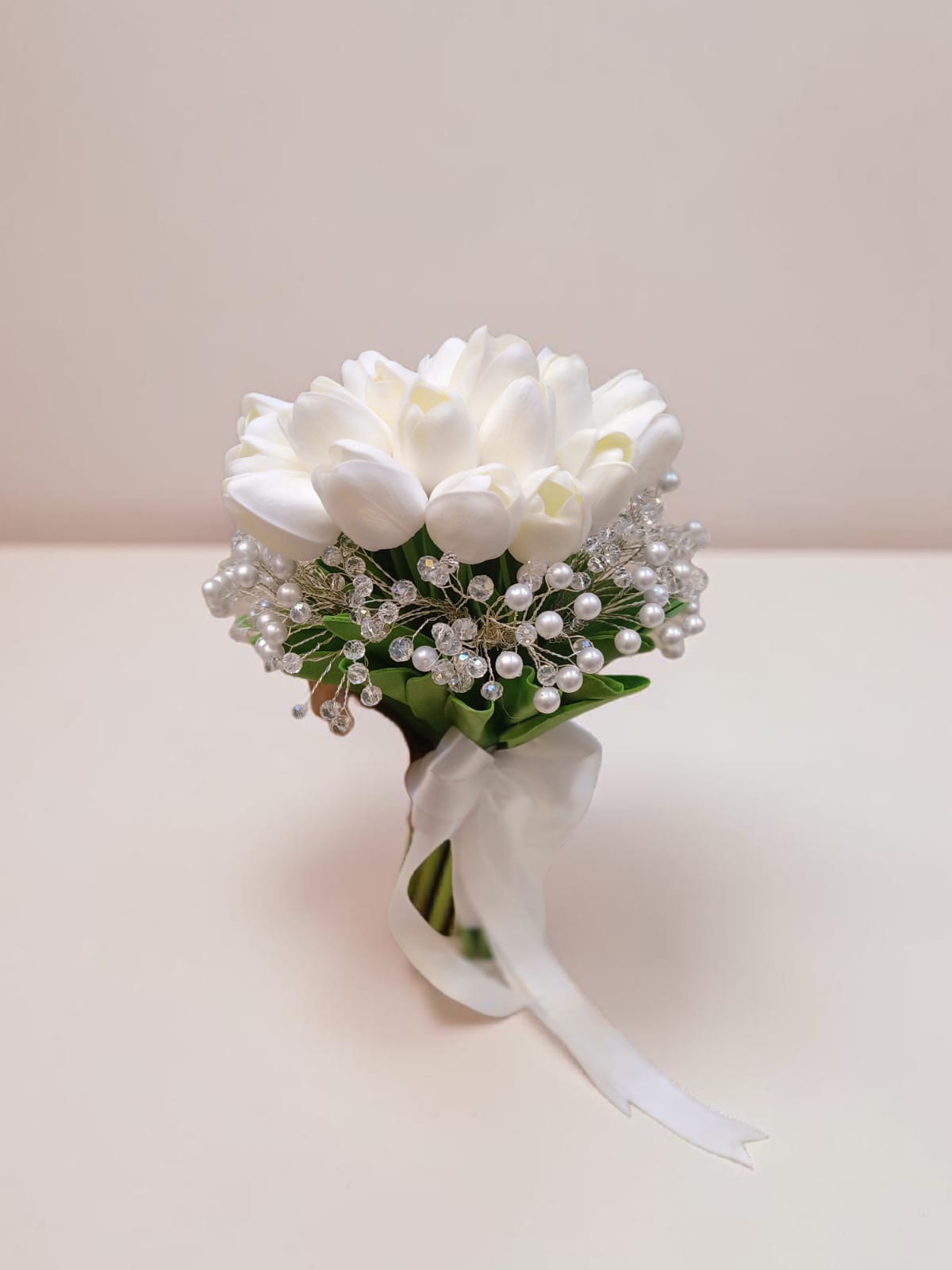 Artificial bridal bouquet with 30 tulips, fake pearl and crystal accessories.