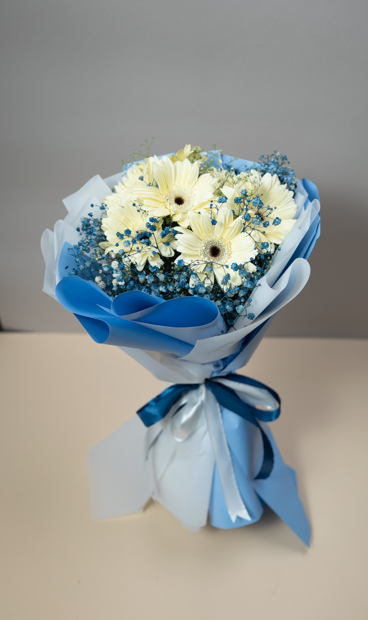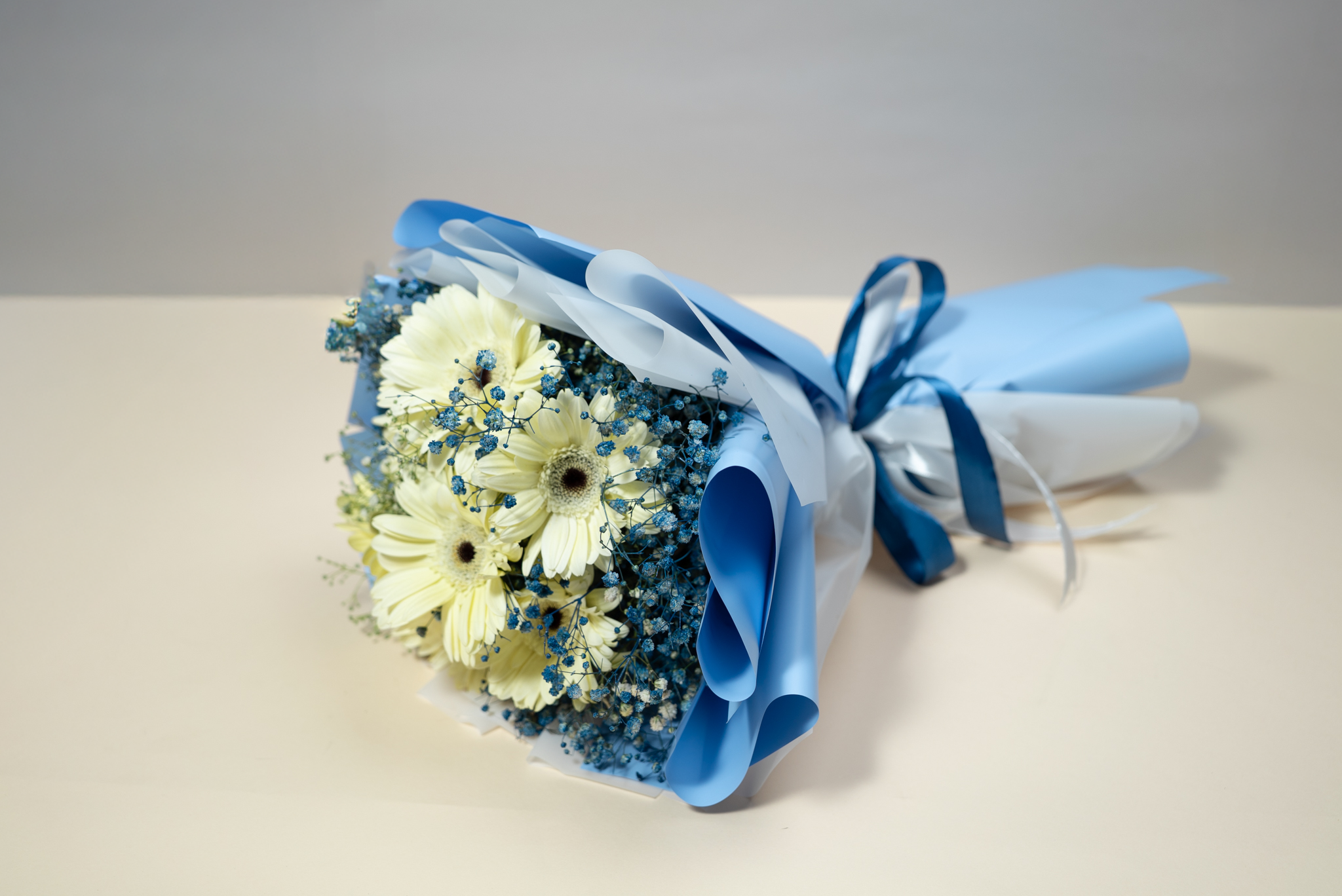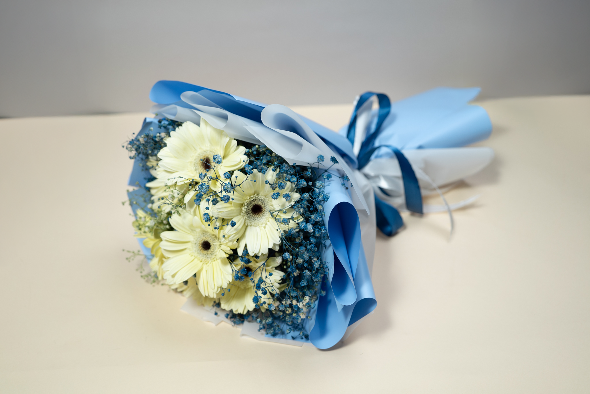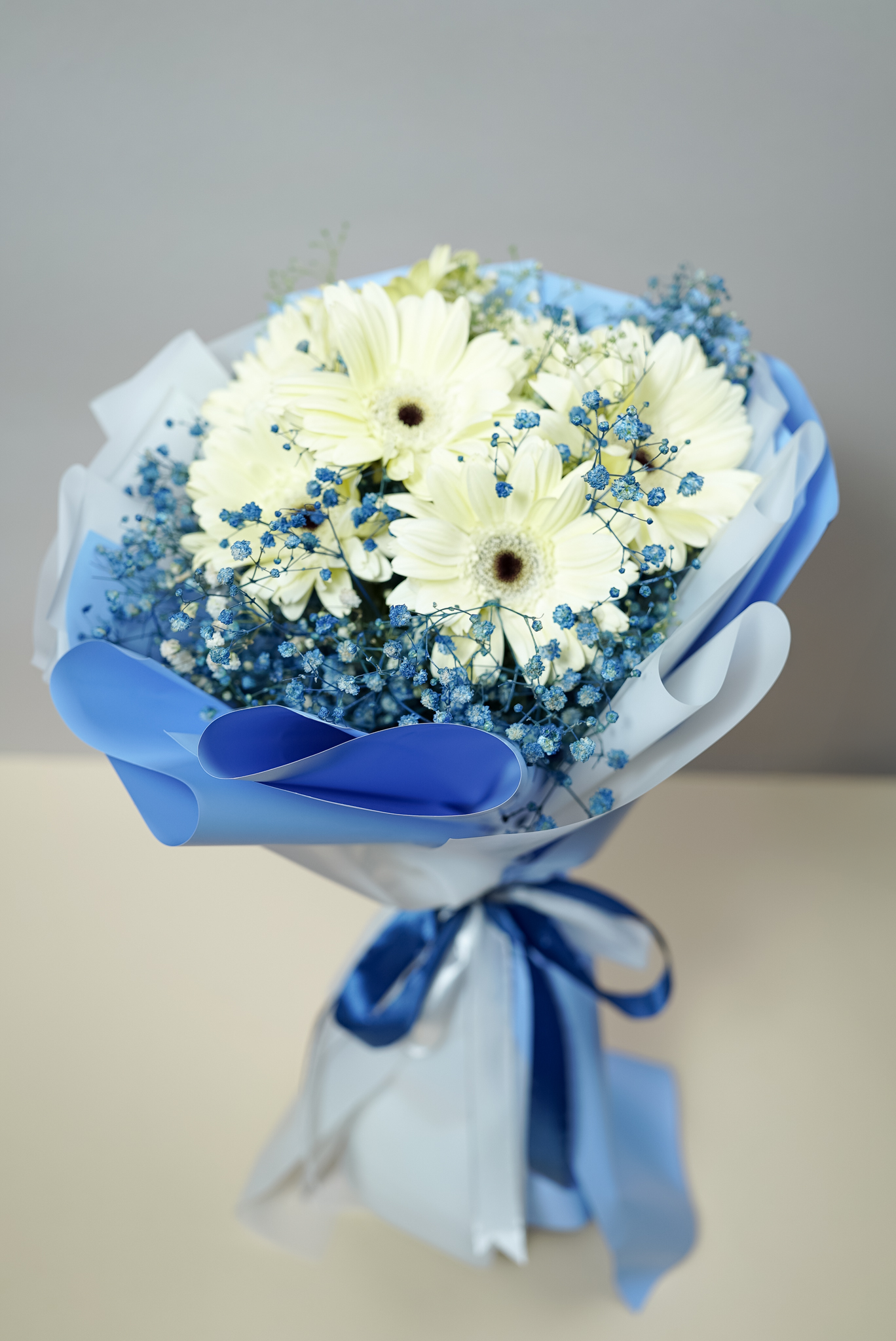 Bouquet of white gerbera flowers and blue baby flower