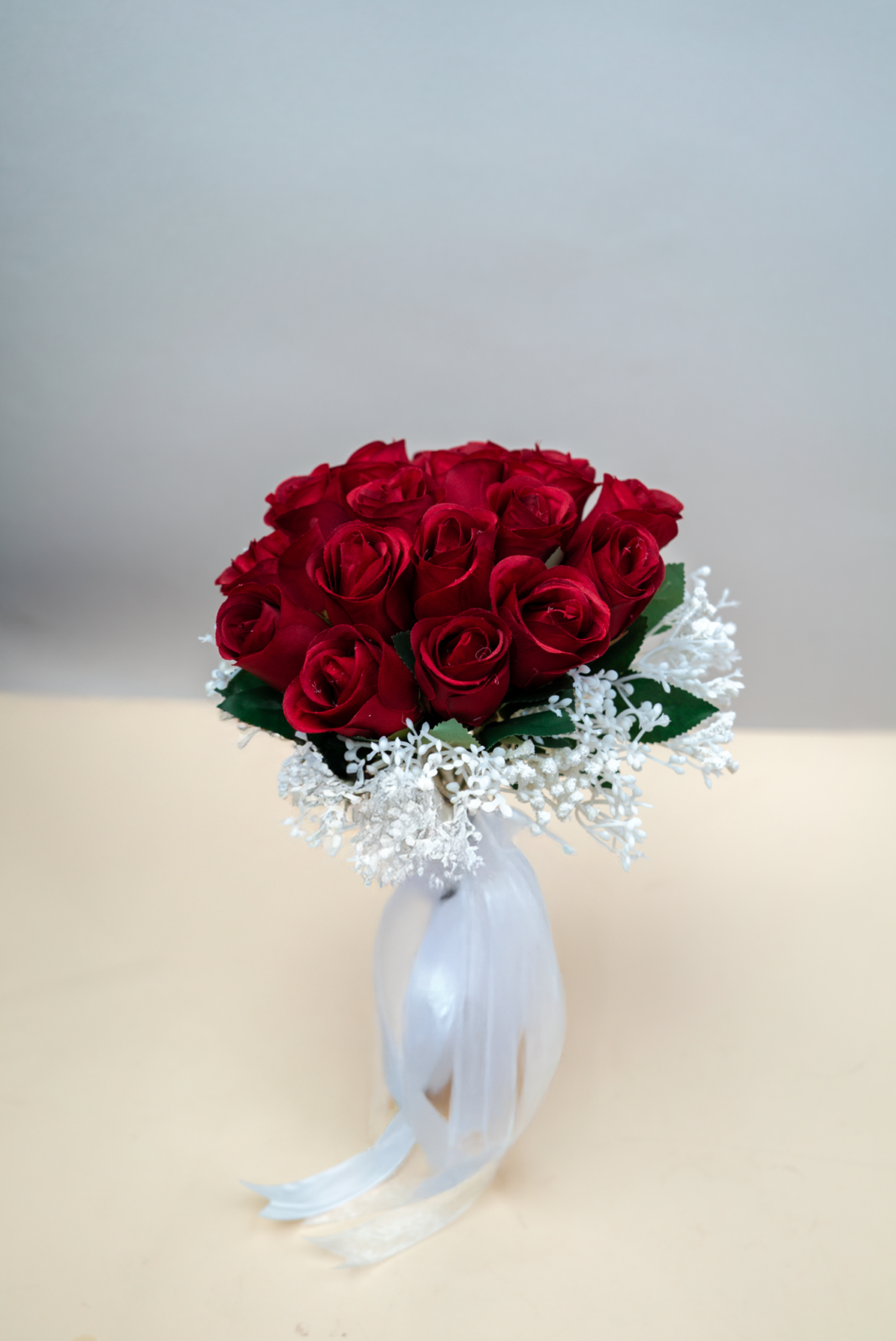 Bridal bouquet with 20 red roses and 12 white baby flowers
