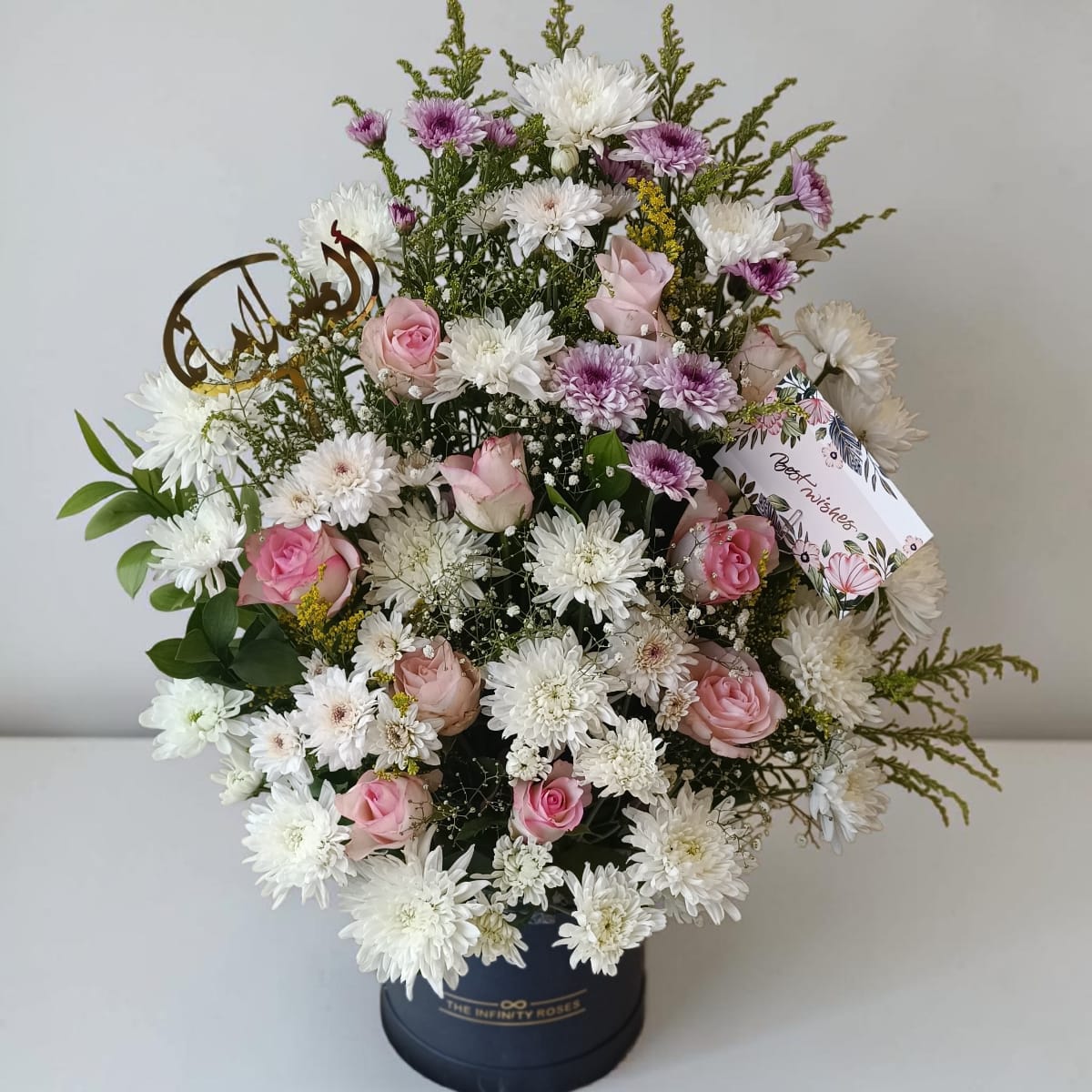 Natural flowers box mix of white and pink and light purple with baby flowers in round box.