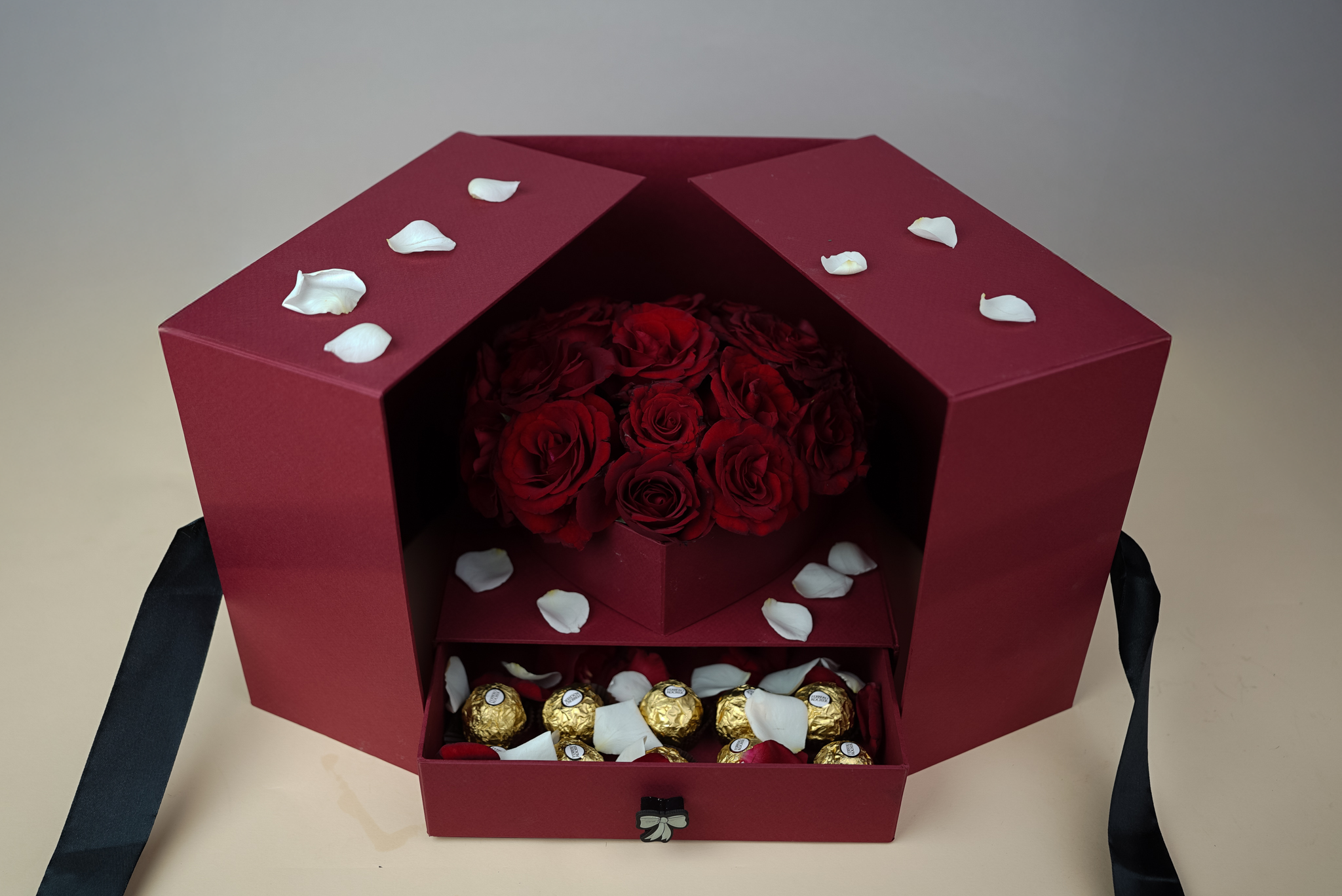 Box opens in two sides contain 15 natural red roses and drawer contain 15 pcs Ferrero rocher