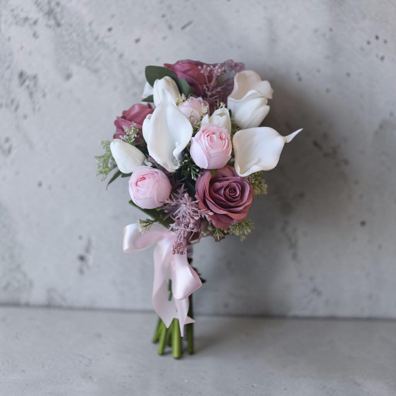 Artificial bridal bouquet mix of Kashmir roses and small pink peony and white tulip and kala