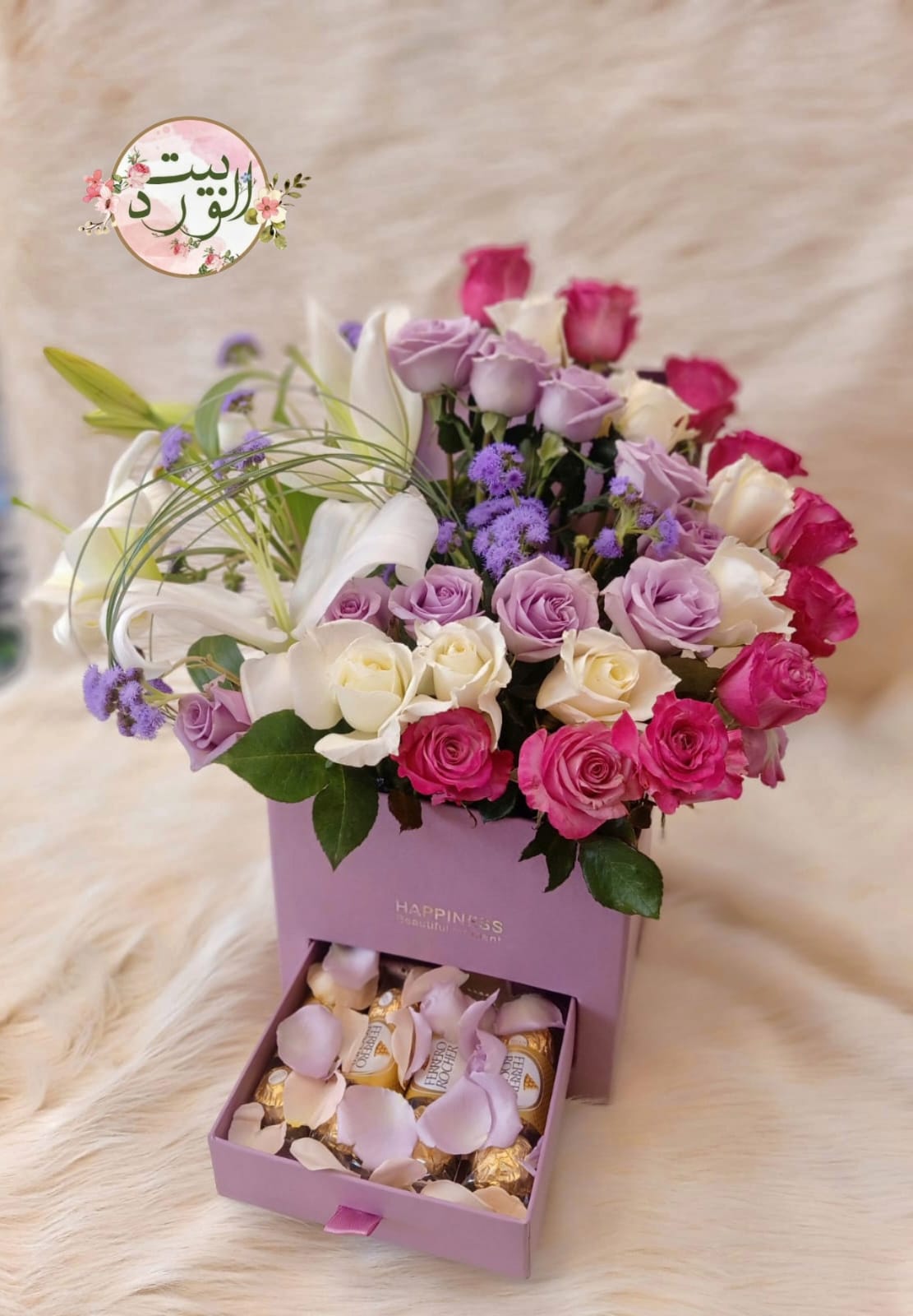 Natural flower box mix of purple, pink and white roses and white lilly All with 12 pcs of Ferraro Rocher chocolate.