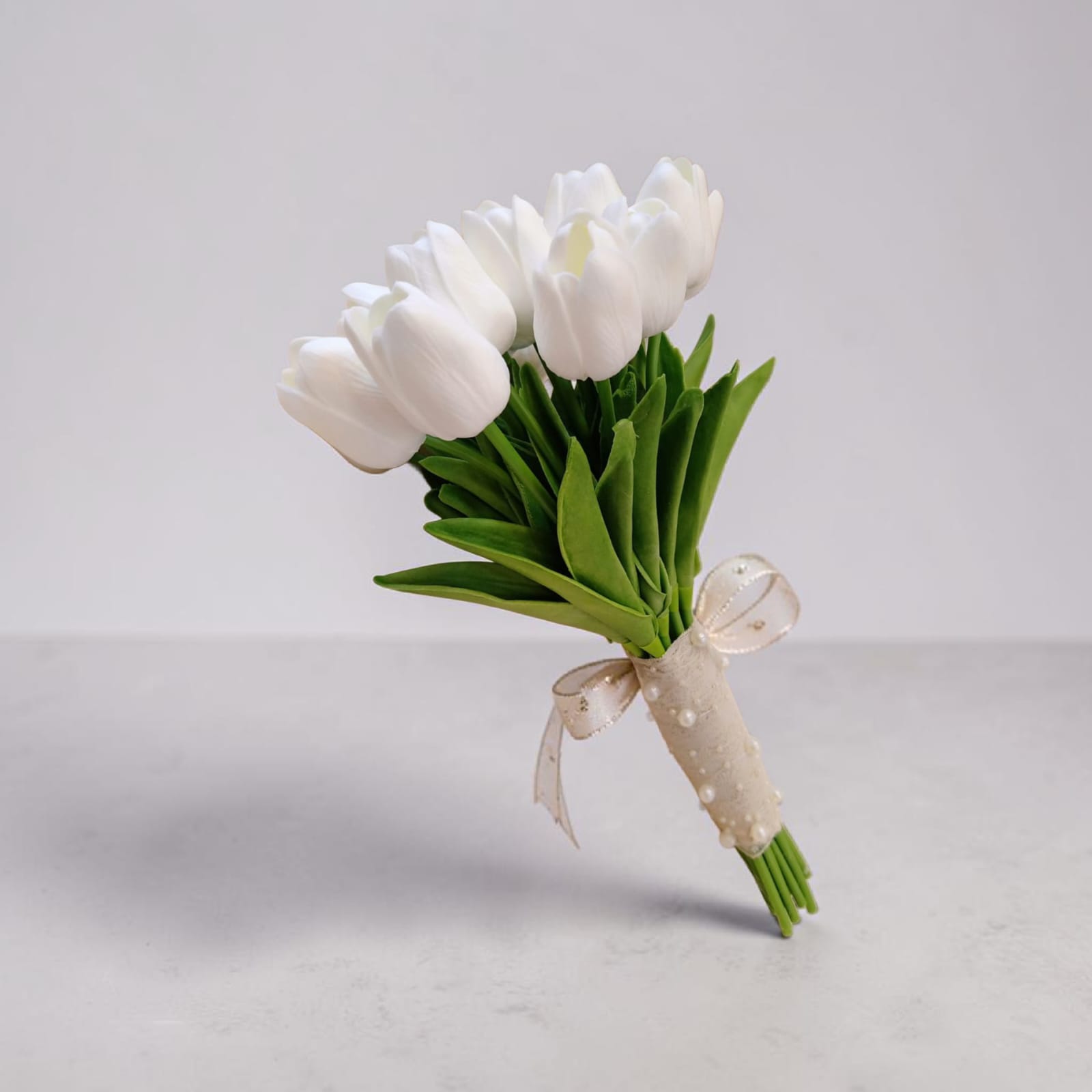 Artificial bridal bouquet with 20 tulips and hand reborn designs with fake half pearls
