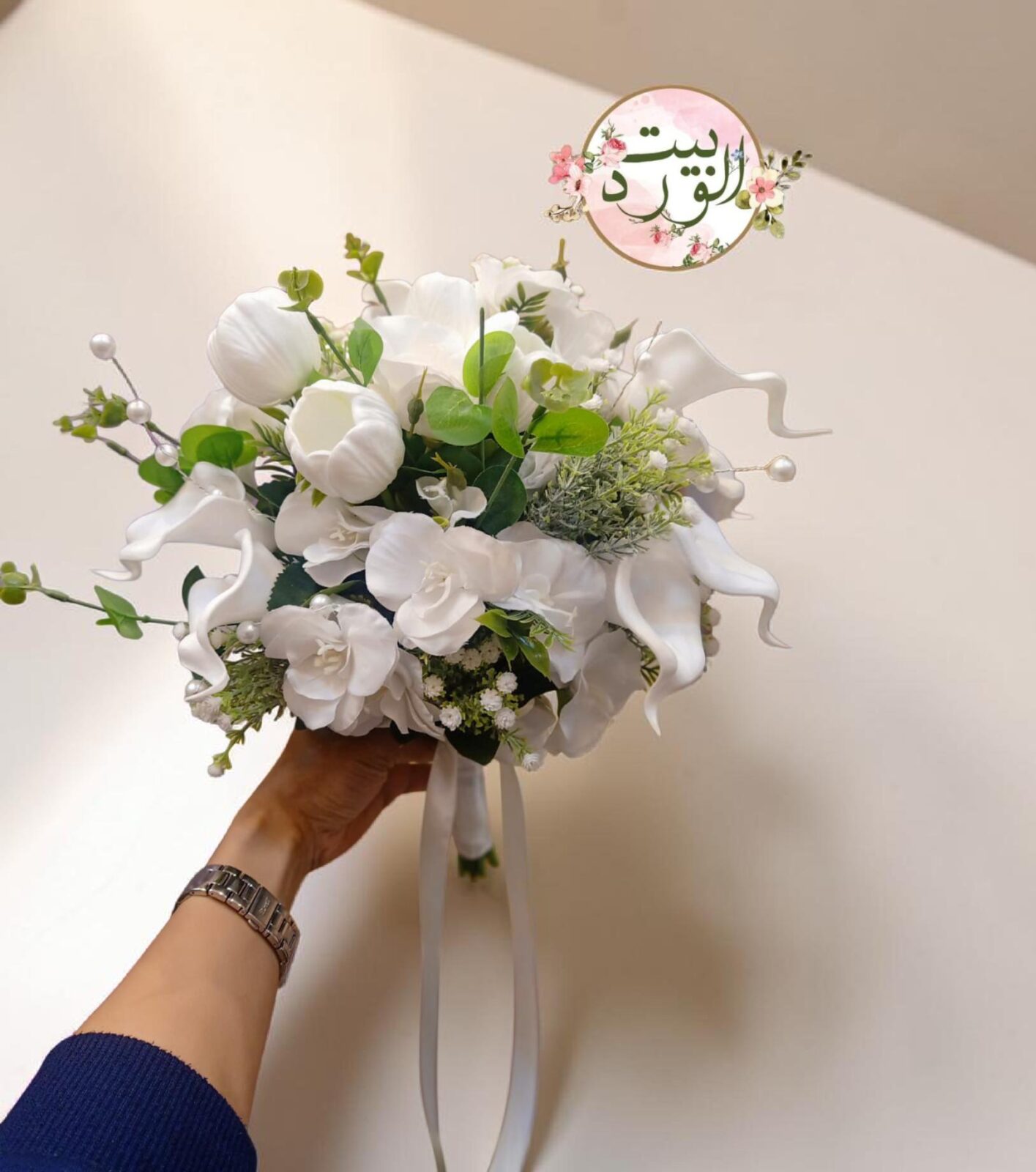 Artificial bridal bouquet of white jumpo tulip and white kala and baby orchid with some green touch all with fake white pearl accessories.