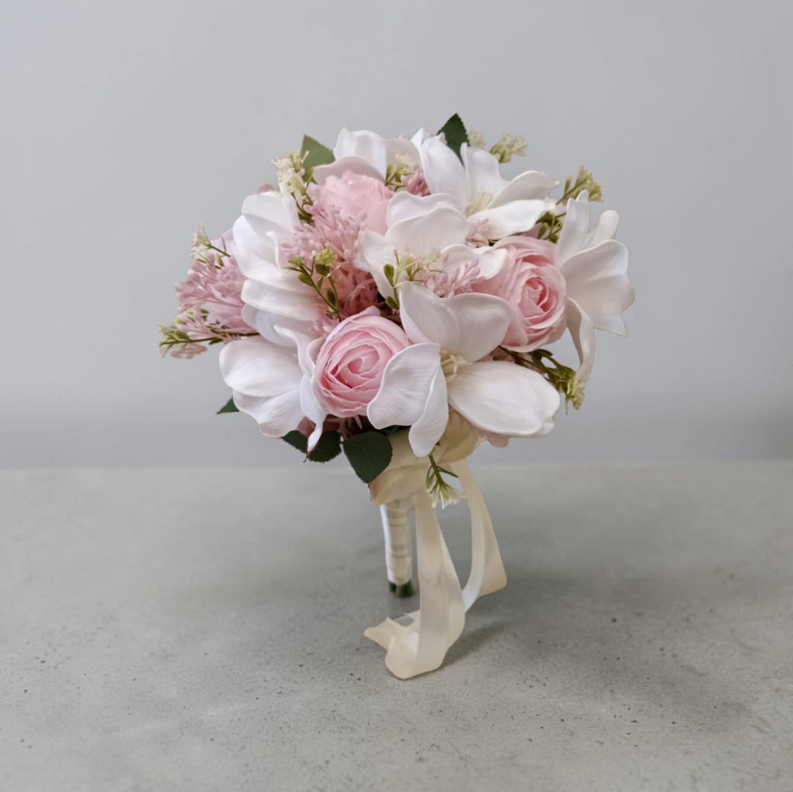 Artificial bridal bouquet mix of 10 pink roses, pink baby flower and 8 open white orchid.