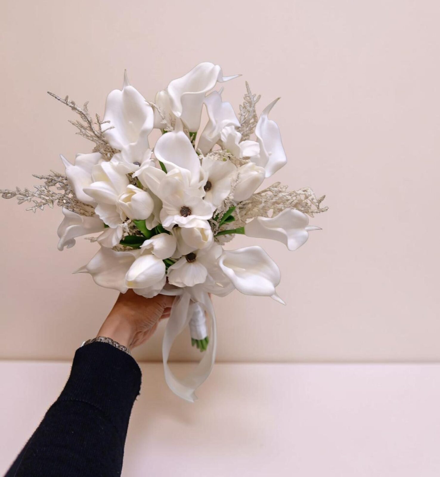 Artificial bridal bouquet of white white tulip and white kala white more accessories.